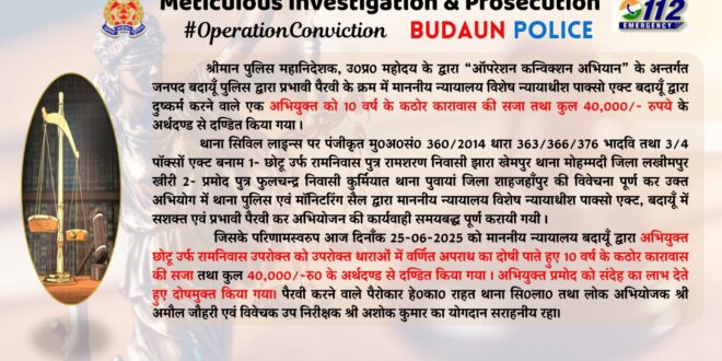 पुलिस महानिदेशक महोदय, उ0प्र0 के आदेश से संचालित #Operation_Conviction अभियान के तहत #SSP_BDN के पर्यवेक्षण मे बदायूं पुलिस की प्रभावी पैरवी से दुष्कर्म करने वाले अभियुक्त को माननीय न्यायालय द्वारा 10 वर्ष का कारावास की सजा एवं 40,000 /-रु0 अर्थदण्ड से दण्डित किया गया।