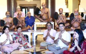 मुरादाबाद। परम पूज्य अभीक्षण ज्ञानोपयोगी आचार्यश्री वसुनंदी जी महामुनिराज को आहारचर्या कराने का सौभाग्य तीर्थंकर महावीर यूनिवर्सिटी के कुलाधिपति सुरेश जैन परिवार को मिला। कुलाधिपति आवास- संवृद्धि में आयोजित आहारचर्या के सुअवसर पर फर्स्ट लेडी श्रीमती वीना जैन, जीवीसी मनीष जैन, श्रीमती ऋचा जैन, एग्जिक्यूटिव डायरेक्टर अक्षत जैन, मेंबर ऑफ गवर्निंग बॉडी सुश्री नंदिनी जैन आदि की उल्लेखनीय मौजूदगी रही। साथ ही महामुनिराज का कुलाधिपति सुरेश जैन को विशेष आशीर्वाद प्राप्त हुआ। दूसरी ओर संत भवन में डेंटल, एमबीबीएस स्टुडेंट्स एंड फैकल्टीज की ओर से संघ में शामिल 23 महाराज जी, छुल्लक जी और आर्यिकाओं की भी आहारचार्य कराई गई। इससे पूर्व वसुनंदी जी महामुनिराज ने जिनालय में श्रीजी का अभिषेक और शांतिधारा विधि-विधान से सम्पन्न कराई। कुलाधिपति परिवार की ओर से ऑडी में ज्ञानोपयोगी आचार्यश्री वसुनंदी जी महामुनिराज और संघ को श्रीफल भी भेंट किया, जबकि महामुनिराज ने कुलाधिपति परिवार को आशीर्वाद स्वरूप ज्ञान संवर्धन हेतु शास्त्र दिए। उल्लेखनीय है, परम पूज्य अभीक्षण ज्ञानोपयोगी आचार्यश्री वसुनंदी जी महामुनिराज का ससंघ रविवार को टीएमयू कैंपस में मंगल आगमन हुआ था, जबकि महामुनिराज ससंघ मंगलवार की शाम को मुरादाबाद महानगर की ओर विहार कर गए।