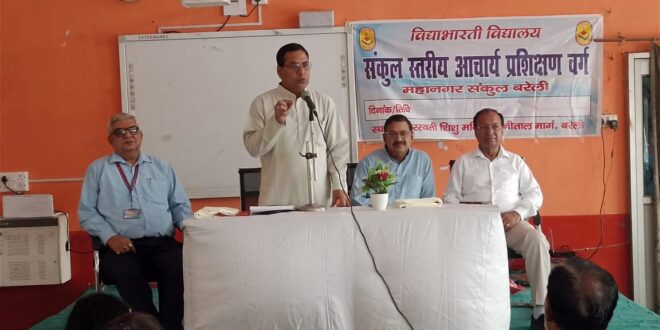 बरेली विद्या भारती विद्यालय बरेली महानगर के सरस्वती शिशु मन्दिरों में पढ़ने वाले सभी आचार्यों का एक दिवसीय अभ्यास वर्ग स्थानीय सरस्वती शिशु मंदिर नैनीताल मार्ग में संपन्न हुआ वंदना सत्र में शिशु शिक्षा समिति ब्रज प्रदेश के जिला समन्वयक श्री सुनील कुमार सिंह एवं बाल कल्याण समिति के सह मंत्री श्री राकेश शर्मा विद्यालय व्यवस्थापक श्री दिनेश मलिक ने मां सरस्वती के समक्ष दीप प्राज्ज्वलन एवं पुष्प अर्चन कर अभ्यास वर्ग का शुभारंभ किया प्रशिक्षण वर्ग की आवश्यकता पर विचार रखते हुए श्री सुनील कुमार सिंह ने कहा शिक्षा, संस्कृति और सभ्यता का संरक्षण शिक्षा ही करती है, अध्यापन कार्य के लिए शिक्षा, निरन्तरता के लिए स्वाध्याय बहुत आवश्यक है, खेल-खेल में शिक्षा दी जाए ,तकनीकी शिक्षा आज के समय में बहुत आवश्यक है। श्री राकेश शर्मा ने कहां विचारों का आदान-प्रदान ही प्रशिक्षण है, समाज हमारी ओर कैसे आकर्षित हो हमें ऐसा कार्य करना चाहिए ।विद्या भारती शिशु वाटिका प्रमुख श्री राम किशोर श्रीवास्तव नें शिशु शिक्षण की बारीकियों पर विचार रखते हुए कहा कि शिक्षक हमारा दर्पण की तरह है जो अपने आचरण से एकाग्रता से शिक्षा प्रदान करें इसके साथ ही क्रियात्मक, गतिविधि एवं सृजनात्मक शिक्षण से ही शिशु अपनी गतिविधियों को अपने शिक्षा में तीव्रता से ग्रहण करता है। किसी के साथ अंग्रेजी विषय का शिक्षण विद्यालय के आचार्य श्री राम किशोर जी ने लिया वैदिक गणित का शिक्षण श्री बसंत लाल जी ने किया। द्वितीय सत्र में शिक्षा विद श्री आर. एन.सक्सेना ने अपने उद्बोधन में बताया शिक्षा एक मनोवैज्ञानिक प्रक्रिया है जिसे मोटिवेट कर सुधार किया जा सकता है, असफलता से सफलता की ओर चलना चाहिए समापन सत्र में श्री राजीव सक्सेना व्यवस्थापक नेकपुर विद्यालय ने अपने विचार रखें। विद्यालय प्रधानाचार्य सुनील कुमार सिंह ने सभी अतिथियों का आभार व्यक्त किया। कार्यक्रम का संचालन श्री राजेश कुमार त्रिपाठी प्रधानाचार्य रामपुर बाग ने किया इस अवसर पर संकुल के सभी प्रधानाचार्य एवं सभी 112 आचार्य,आचार्या उपस्थित रहे उक्त जानकारी वर्ग मीडिया प्रभारी राजेश कुमार शर्मा ने दी।