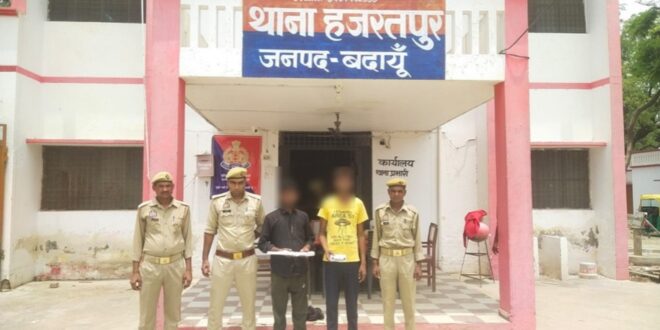 वरिष्ठ पुलिस अधीक्षक, बदायूँ डॉ0 बृजेश कुमार सिंह के निर्देशानुसार जनपद में चलाये जा रहे अपराध की रोकथाम एवं अभियुक्तों की गिरफ्तारी अभियान के तहत अपर पुलिस अधीक्षक ग्रामीण के पर्यवेक्षण एवं क्षेत्राधिकारी दातागंज एवं प्रभारी निरीक्षक हजरतपुर के नेतृत्व में थाना हजरतपुर पुलिस द्वारा मु0अ0सं0 99/2025 धारा 303(2)/317(2) बीएनएस बनाम अभियुक्तगण 1. राजकुमार पुत्र मोरपाल उम्र 32 बर्ष निवासी ग्राम हजरतपुर थाना हजरतपुर जनपद बदायूँ 2. सूरज पुत्र जुगेन्द्रपाल उम्र 23 वर्ष निवासी ग्राम आसफपुर थाना हजरतपुर जनपद बदायूँ को मय एक अदद तमंचा 12 बोर, दो कारतूस 12 बोर, एक टैम्पू तथा 20,000/- रू0 नगद समेत गिरफ्तार किया गया। अभियुक्तगण उपरोक्त के विरुद्ध विधिक कार्यवाही कर माननीय न्यायालय जनपद बदायूं के समक्ष पेश किया गया।