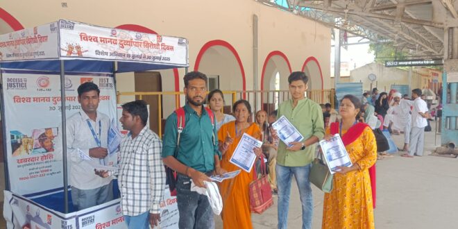 आज जस्ट राइट फॉर चिल्ड्रन के सहयोग से काशी समाज शिक्षा विकास संस्थान द्वारा रेलवे स्टेशन पर प्रभारी रेलवे सुरक्षाबल संदीप कुमार भारती व समस्त स्टाफ एवं जी0 आर0पी0 के समस्त स्टाफ द्वारा मानव तस्करी विरोधी दिवस के अवसर अभियान का शुभारंभ किया गया जिसमें प्लेट फॉर्म पर ट्रेन से आने जाने वाले सभी यात्रियों को बाल तस्करी की जानकारी दी गई और प्लेट फॉर्म पर रेडी वाले, चाय की दुकान वाले, पान की दुकान वाले, और टैम्पो, चालक, व यात्रियों को संस्था सचिव, संस्था समन्वयक प्रोजेक्ट मैनेजर, काउंसलर व समस्त स्टाफ ने पम्पलेट देकर विस्तार से बताया और ट्रेनों में भी पम्पलेट स्टीकर चिपकाकर लोगों को जानकारी देकर अभियान चलाया ।