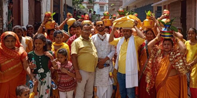 में श्रीमद भागवत कथा के शुभारंभ से पूर्व पीत वस्त्रधारी महिलाओ ने कलशयात्रा निकाली। इसके हवन पूजन किया गया और भागवत कथा का शुभारंभ हुआ।