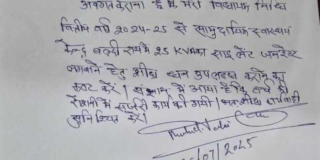 सुल्तानपुर : सामुदायिक स्वास्थ्य केंद्र में टॉर्च की रोशनी में हो रहे इलाज मामले को विधायक इसौली ताहिर खान ने लिया संज्ञान में,मुख्य विकास अधिकारी को लिखी चिट्ठी।सामुदायिक स्वास्थ्य केंद्र पर मरीज़ों को टॉर्च की रोशनी में इलाज किया जा रहा था, विद्युत की समुचित व्यवस्था नही थी मामला संज्ञान में आते ही एक्टिव हुए विधायक ताहिर खान चिट्ठी लिखते हुए कहा कि केंद्र पर साइलेंट जनरेटर लगवाने की व्यवस्था मुख्य विकास अधिकारी करें।