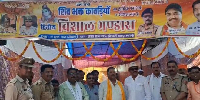 म्याऊं दिन रविवार को थाना अलापुर चौकी म्याऊं के सहयोग से चौकी म्याऊं पर शिव भक्त कांवरिया को भंडारे की व्यवस्था की गई इस भंडारे में दातागंज विधायक राजीव कुमार सिंह उर्फ बब्बू भईया भी मौजूद रहे उन्होंने कावरियों को अपने हाथ से भोजन कराया और चौकी क्षेत्र की महान हस्तियां ओमेंद्र प्रताप सिंह ,रवेंद्र प्रताप सिंह अमर सिंह शारदा कांत उर्फ सीकु भईया ,जितेंद्र सिंह ,अनुरोध गुप्ता आदि ने शिव भक्त कावरियों को भोज कराया दातागंज क्षेत्राधिकारी के के तिवारी थाना प्रभारी अलापुर उदयवीर सिंह ,चौकी प्रभारी देवेंद्र सिंह ने अपनी देखरेख में भोले भक्तों को सुरक्षा का पूरा इंतजाम कर उनके ऊपर पुष्प वर्षा कर उन्हें शीतल जल पिलाकर भेज रहे थे थाना चौकी पुलिस ने भंडारे की इतनी व्यवस्था कर रखी थी कि पूरी रात तक भंडारा चलता रहा और जो राहगीर भी निकल रहा था उसे बिना भोजन कराए पुलिस जाने ही नहीं दे रही थी