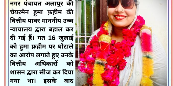 बदायूं। नगर पंचायत अलापुर की चेयरमैन हुमा फ़हीम की वित्तीय पावर माननीय उच्च न्यायालय द्वारा बहाल कर दी गई हैं। गत 16 जुलाई को हुमा फ़हीम पर घोटाले का आरोप लगाते हुए उनके वित्तीय अधिकारों को शासन द्वारा सीज कर दिया गया था। इसके बाद चैयरमैन ने हाईकोर्ट की शरण ली, जहां सुनवाई के बाद कोर्ट ने शासन द्वारा की गई कार्यवाही पर रोक लगाते हुए पुनः बहाल कर दिया गया हैं। इस फैसले से चेयरमैन समर्थकों में जश्न का माहौल हैं। वरिष्ठ नेता/चेयरमैन पति फ़हीम उद्दीन ने हाईकोर्ट का आभार व्यक्त करते हुए कहा कि ये सच्चाई की जीत है।