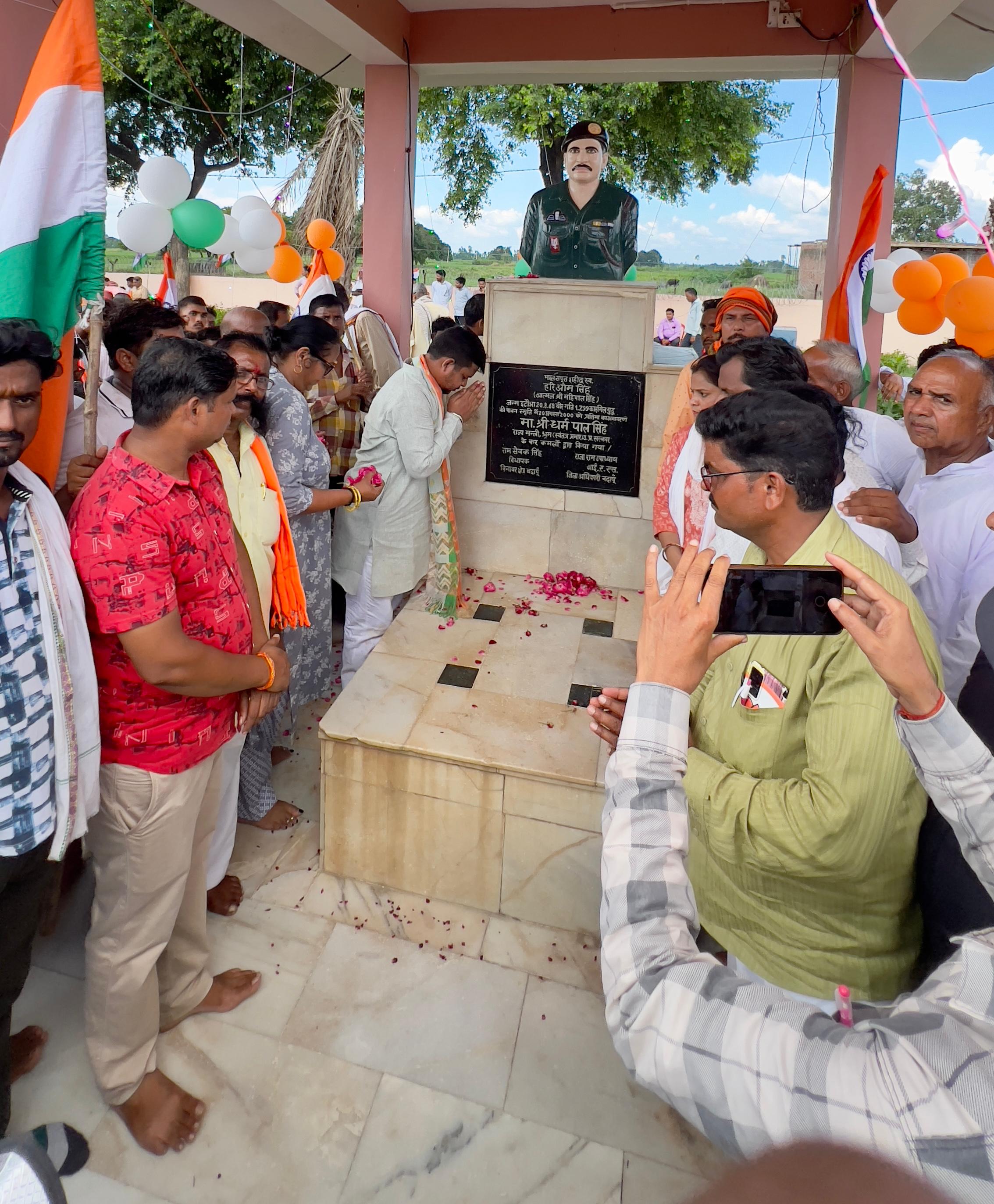इस भव्य तिरंगा यात्रा की मेजबानी उनके पुत्र कुंवर प्रताप सिंह उर्फ शिवम जी एवं ब्लाक प्रमुख वजीरगंज श्रीमती गुड्डो देवी ने की यह यात्रा विकासखंड कार्यालय से निकलकर वजीरगंज नगर में होते हुए सैदपुर कतगांव बगरैन मुड़िया सतासी होकर शहीद स्मारक हरिओम नगर इटौआ में पूर्ण हुई इस यात्रा का विभिन्न स्थानों पर जोरदार स्वागत किया गया वजीरगंज में श्री रोहित बंशीधर श्री रवि टेंट हाउस उपेंद्र वार्ष्णेय आदि ने स्वागत किया सैदपुर में ने निवर्तमान चेयरमैन पति विकार अहमद खान एवं श्री बच्चन शेख व पन्ना ट्रेडर्स ने भव्य स्वागत किया इसी श्रृंखला में बगरैन के श्री मनोहर सिंह यादव जी राजीव पाराशरीजी संदीप मिश्रा जी शारिक खान महेश गुप्ता जितेंद्र गुप्ता गुलाम नबी विपिन गुप्ता दीनदयाल महेश्वरी आदि ने जोरदार स्वागत किया इस कार्यक्रम में विकास खंड के समस्त ग्राम प्रधान बीडीसी मेंबर एवं ब्लाक के अधिकारी गण उपस्थित रहे साथ ही कारगिल शहीद श्री हरिओम सिंह जी की पत्नी गुड्डू देवी ने भी पुष्पांजलि अर्पित कर नमन किया व मंडल अध्यक्ष बगरैन श्री रितेश चौहान जी मंडल अध्यक्ष बिसौली ग्रामीण सुनील कुमार सिंह एडवोकेट रीना राघव दीपेश वार्ष्णेय अंबुज सिंह पूर्व सदस्य जिला पंचायत आशीष सिंह संजू सिंह भूपेंद्र सिंह अनुज कांत मिश्रा आदि भाजपा के जेस्ठ श्रेष्ठ कार्यकर्ता एवं पदाधिकारी गण उपस्थित रहे यात्रा के समापन पर सभी व्यक्तियों के द्वारा कारगिल शहीद हरिओम सिंह जी को पुष्पांजलि अर्पित कर नमन किया गया इस यात्रा में हजारों की संख्या में लोग सम्मिलित हुए