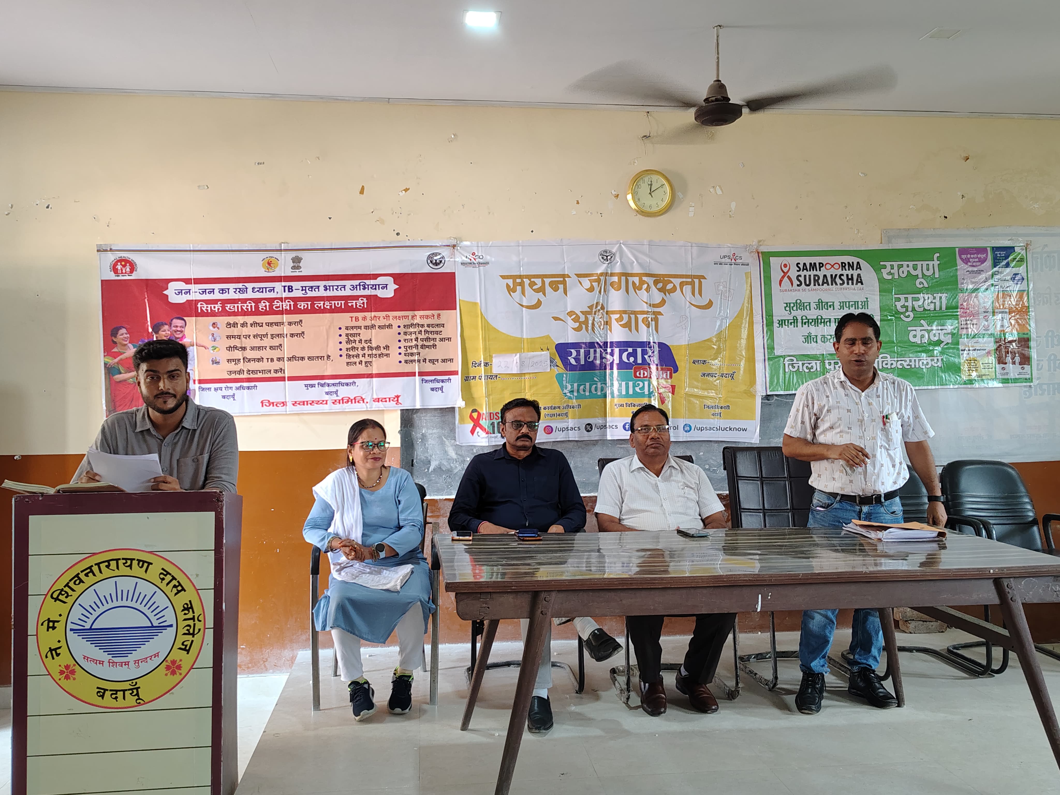 के उपलक्ष्य में सघन एड्स जागरूकता अभियान के सफल संचालन हेतु एक गोष्ठी का आयोजन प्रोफेसर डॉ आशीष कुमार सक्सेना प्राचार्य की अध्यक्षता में किया गया l इसके बाद जिला कार्यक्रम अधिकारी (एड्स ) डॉ विनेश कुमार द्वारा जनपद में एच आई वी/ एड्स होने के 4 कारण असुरक्षित यौन सम्बन्ध,एच आई वी ग्रस्त महिला से होने वाले उसके बच्चे, एच आई वी ग्रस्त व्यक्ति का ब्लड दूसरे को चढ़ाने, एच आई वी से संक्रमित व्यक्ति की सिरिंज से दूसरे को इंजेक्शन लगाने से फैलता है l शनि दुवे प्रोग्राम मैनेजर लोक कल्याण समिति बदायूं द्वारा बताया गया कि जहाँ एच आई वी के केस निकले हैँ उन ग्राम पंचायतों के साथ साथ एफ एस डब्लू, एम एस डब्लू, ड्रग यूजर्स में एड्स को फैलने, जाँच, बचाव, एवं इलाज के बारे में जागरूक किया l सुदेश सक्सेना डी पी टी सी /एस टी एस द्वारा बताया गया की एच आई वी /एड्स से ग्रसित मरीजों में टी बी की बीमारी होने का खतरा सबसे ज्यादा रहता है इसलिए सभी एच आई वी बाले मरीजों की टी बी की जाँच होना आवश्यक है l रेशमबती काउंसलर के द्वारा गर्वभती महिलाओं में एच आई वी की जाँच एवं उसके होने बाले बच्चे को एच आई वी से बचाव के बारे में बताया l राजेश काउंसलर द्वारा भी कार्यक्रम के बारे में विस्तार से बताया गया l कार्यक्रम का संचालन सुदेश सक्सेना द्वारा गया l कार्यक्रम मे प्रोफेसर मनवीर सिंह, प्रोफेसर डॉ रवि भूषण पाठक, प्रोफेसर डॉ सत्यम मिश्रा उपस्थित रहे l