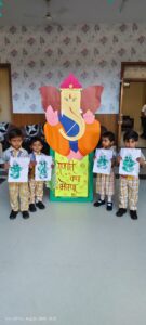 विद्यालय की प्ले ग्रुप कक्षा के बच्चों ने पत्तियों और रंगों की सहायता से भगवान गणेश की सुंदर छवि बनाई और उसे सजाकर अपनी कला का प्रदर्शन किया। नर्सरी कक्षा के बच्चों ने रंग-बिरंगे कागज़ों से पेपर पेस्टिंग के माध्यम से गणेश जी की मनमोहक आकृतियाँ तैयार कीं, जिन्हें सभी ने बेहद सराहा। वहीं केजी कक्षा के बच्चों ने भगवान गणेश के प्रिय व्यंजन ‘मोदक’ बनाकर उत्सव में विशेष आनंद और भक्ति का संचार किया।