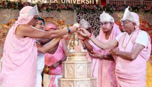मुरादाबाद। पर्वाधिराज दशलक्षण महामहोत्सव का जिनालय पर ध्वजारोहण के संग शंखनाद हुआ। उत्तम क्षमा दिवस पर ध्वजारोहण के दौरान विधि-विधान की प्रक्रिया प्रतिष्ठाचार्य श्री ऋषभ जैन शास्त्री के सानिध्य में हुई। उन्होंने समुच्चय पूजन, सोलह कारण, पंच मेरु पूजन, दशलक्षण पूजन कराया। सुबह सात बजे श्री 1008 आदिनाथ भगवान को पालकी में विराजमान करने का सौभाग्य सौधर्म इंद्र के रुप में प्रो. एसके जैन को प्राप्त हुआ। दिव्यघोष के बीच श्रीजी को मंदिर से रिद्धि-सिद्धि भवन तक लाया गया, जिसमें श्रावक-श्राविकाएं नृत्य आदि में मंत्र-मुग्ध हो गए। श्रीजी का समोवशरण रिद्धि-सिद्धि भवन में किया गया। पालकी को उठाने का सौभाग्य प्रथम इंद्र- कलश जैन, द्वितीय इंद्र- प्रिंस जैन, तृतीय इंद्र- सम्यक जैन को मिला। ध्वजारोहण से पालकी यात्रा के दौरान कुलाधिपति सुरेश जैन, फर्स्ट लेडी श्रीमती वीना जैन, श्रीमती ऋचा जैन, श्रीमती जहान्वी जैन के संग-संग समस्त टीएमयू जैन परिवार की उल्लेखनीय उपस्थिति रही। दिव्यघोष के दौरान श्रावक केसरिया धोती-दुपट्टा पहने थे, जबकि श्राविकाएं केसरिया और सफेद कुर्ता- सफेद सलवार, नारंगी चुनरी के संग पहनी थी, जबकि कुलाधिपति, जीवीसी और ईडी ऑफ पिंक परिधान धारण किए हुए थे। इनकी भव्यता देखते ही बनती थी। प्रतिष्ठाचार्य श्री ऋषभ जैन शास्त्री ने श्रावक-श्राविकाओं का नियम दिलाया कि आज कोई भी क्रोध नहीं करेगा।