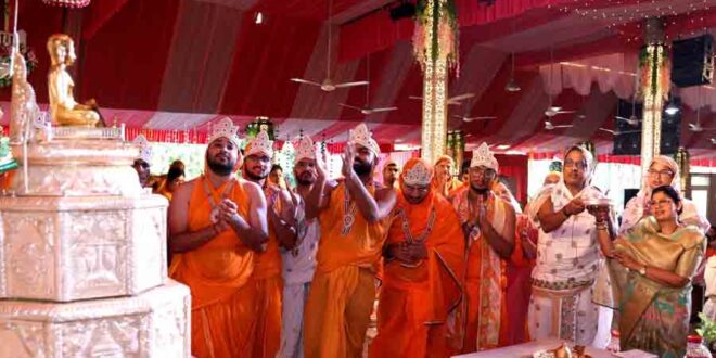 मुरादाबाद। तीर्थंकर महावीर यूनिवर्सिटी, मुरादाबाद में पर्वाधिराज दशलक्षण महामहोत्सव के आठवें दिन उत्तम त्याग पर प्रतिष्ठाचार्य श्री ऋषभ जैन शास्त्री के सानिध्य में समुच्चय पूजन, श्री शांतिनाथ जिनपूजा, सोलहकारण पूजन, दशलक्षण पूजा विधि-विधान के साथ हुए। साथ ही गणिनी प्रमुख ज्ञानमती माताजी के स्वास्थ्य लाभ हेतु नवकार मंत्र का जाप भी किया गया। कुलाधिपति परिवार की ओर से जैन धर्म में माता जी के अनमोल योगदान का स्मरण करते हुए उनके जल्द से जल्द स्वास्थ लाभ की कामना की गई। उल्लेखनीय है, गणिनी प्रमुख ने जैन धर्म पर 200 से अधिक पुस्तकें लिखी हैं। उत्तम त्याग के दिन पूजा सामग्री बनाने वाले श्रावक-श्राविकाओं का स्वागत किया गया। प्रथम स्वर्ण कलश से तनिषा जैन, द्वितीय स्वर्ण कलश से श्री पार्थ जैन, तृतीय स्वर्ण कलश से प्रो. विपिन जैन, चतुर्थ स्वर्ण कलश से श्री आदर्श जैन को अभिषेक का सौभाग्य मिला। प्रथम स्वर्ण शांतिधारा का पुण्य डॉ. एसके जैन, डॉ. सम्यक माली, डॉ. योजश, डॉ. सिद्धार्थ, डॉ. सारांश, डॉ. समर्थ, डॉ. संयम, डॉ. नील, डॉ. अनिकेत, श्री वेदांत, डॉ. खुशी गांधी ने कमाया। द्वितीय रजत शांतिधारा का सौभाग्य श्री सुहित, श्री अनन्त, श्री अनिकेत, श्री प्रभास, श्री प्रांजल, श्री मोहित, श्री रिदम जैन को मिला। अष्ट कुमारी का पुण्य परी, खुशी, अंजलि, भूमि, प्रियांशी, वंशिका, खुशी, अक्षिता, जेसिका जैन ने कमाया। तत्वार्थ सूत्र के अष्टम अध्याय का वाचन श्री मनीष जैन ने किया। उत्तम तप धर्म पर कुलाधिपति श्री सुरेश जैन, फर्स्ट लेडी श्रीमती वीना जैन, जीवीसी श्री मनीष जैन, श्रीमती ऋचा जैन, एग्जिक्यूटिव डायरेक्टर श्री अक्षत जैन, श्रीमती जाह्नवी जैन आदि की गरिमामयी मौजूदगी रही।
