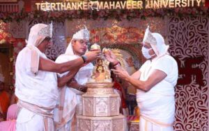 उत्तम ब्रह्मचर्य धर्म दिवस पर स्वर्ण कलश से श्रीजी के अभिषेक का सौभाग्य एग्जिक्यूटिव डायरेक्टर श्री अक्षत जैन, वीसी प्रो. वीके जैन को मिला। प्रथम स्वर्ण कलश से वीसी, द्वितीय और चतुर्थ स्वर्ण कलश से एग्जिक्यूटिव डायरेक्टर, तृतीय कलश से श्री ऋतिक जैन ने अभिषेक करने का पुण्य कमाया। श्रीजी की प्रथम स्वर्ण शांतिधारा का सौभाग्य ईडी श्री अक्षत जैन को मिला। द्वितीय रजत शांति धारा का सौभाग्य श्री सिद्धार्थ जैन, सौम्या जैन, श्री हर्षित जैन, प्रो. विपिन जैन, श्री अक्षत जैन, श्री अजजीत जैन, श्री आदित्य डाखोरे, श्री आदित्य जैन को मिला। साथ ही अष्ठ प्रातिहार्य का सौभाग्य अष्ठ कन्याओं- अंजलिना, भूमि, स्तुति, शिवानी, मान्या, रिदम, छवि, प्रिंसी आदि को मिला। वासुपूज्य भगवान के मोक्ष कल्याणक का प्रथम लाडू चढ़ाने का सौभाग्य प्रो. विपिन जैन, श्री वीर प्रताप जैन, युक्ति जैन, श्री हर्ष जैन, श्री अनमोल जैन, श्री आर्जव जैन, श्री पर्व जैन, श्री वर्धन जैन, चाहत जैन, श्री दिव्यांश जैन, श्री दिव्यांश जैन, श्री सम्यक जैन ने प्राप्त किया। द्वितीय लाडू चढ़ाने का सौभाग्य श्री संभव जैन, श्री विशाल जैन, श्री संयम जैन, श्री गौरव जैन, अनाया जैन, नियति जैन, श्री राजकुमार जैन, श्री अक्षत जैन, श्री निखिल जैन, श्री सुब्रत जैन, पायल जैन, श्री निशंक जैन को मिला। भक्तांबर पाठ का वाचन हर्ष और अर्श जैन ने किया।