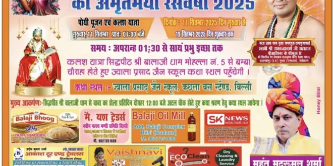 बिल्सी नगर के मौहल्ला संख्या पांच में स्थित सिद्ध पीठ श्रीबालाजी धाम मंदिर के महंत मटरुमल शमां महाराज जी के तत्वावधान में आयोजित श्रीमद्भागवत कथा का भव्य आयोजन जेपी जैन स्कूल में कल 11 सितंबर 2025 दिन वृहस्पतिवार से 19 सितंबर 2025 दिन शुक्रवार तक श्रीमद्भागवत कथा का आयोजन होगा सिद्ध पीठ श्रीबालाजी धाम से पहले डोला से प्रतिदिन हनुमान जी कथा श्रवण करने जाते हैं कथा स्थल महाराज जी ने बताया है कि इस बार उड़ीसा के कारीगरों द्वारा आकर्षण रूप से रथ तैयार किया गया है सिद्ध पीठ श्रीबालाजी धाम से प्रतिदिन कथा श्रवण करने हनुमान जी दिव्य रथ से जायेगे श्रीमद्भागवत कथा श्रवण करने के बाद बापिस दिव्य रथ से सिद्ध पीठ श्रीबालाजी धाम मंदिर परिसर में आयेंगे महाराज जी ने बताया कि