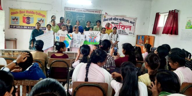 आज गिन्दो देवी महिला महाविद्यालय, बदायूं द्वारा हिन्दी दिवस की पूर्व संध्या पर हिन्दी विभाग द्वारा प्रश्नोत्तरी और पोस्टर प्रतियोगिता का आयोजन किया गया। पोस्टर प्रतियोगिता में आंशिक पटेल प्रथम, रिया द्वितीय और उर्वशी ने तृतीय स्थान प्राप्त किया। हिन्दी दिवस के उपलक्ष्य में काव्य पाठ और ‘हिन्दी का भविष्य ‘ विषय पर संगोष्ठी का आयोजन किया गया। कार्यक्रम में बी ए प्रथम, द्वितीय एवं तृतीय वर्ष की छात्राओं ने भाग लिया। छात्राओं ने वर्तमान में हिन्दी भाषा की दशा पर चर्चा करते हुए उसके भविष्य एवं चुनौतियों पर चर्चा की। अंग्रेजी के सापेक्ष हिन्दी के प्रति हेय दृष्टि, संस्थाओं व अदालतों में अंग्रेजी के प्रयोग, अंग्रेजी संस्कृति के प्रति श्रेष्ठताबोध, व विभिन्न भाषाभाषी लोगों द्वारा हिन्दी का अस्वीकार इत्यादि चुनौतियों को क्रमशः उर्वशी, रिया,शगुन व मुस्कान द्वारा रेखांकित किया गया। सृष्टि, उर्मिला,सेजल आदि छात्राओं ने काव्य पाठ किया।कार्यक्रम अध्यक्षा प्राचार्या डॉ सरला देवी चक्रवर्ती ने अपने वक्तव्य में कहा कि हिन्दी दिवस हमारी सांस्कृतिक जड़ो को देखने और अपनी समृद्धशाली इतिहास को याद करने का दिन है। मुख्य वक्ता के रुप में डॉ उमा सिंह गौर ने बताया कि हिन्दी हमारी परंपरा, संस्कृति और साहित्य की धरोहर है इसलिए हमें इस भाषा पर गर्व होना चाहिए।डॉ इति अधिकारी ने हिन्दी की इतिहास पर प्रकाश डाला। कार्यक्रम की संचालिका डाॅ निशा साहू ने बताया कि हिन्दी भाषा भारत की पहचान है, हिन्दी के विकास से ही देश का विकास संभव है।डॉ पूनम सिंह ने हिन्दी भाषा की चुनौतियों की चर्चा करते हुए उसे राष्ट्रभाषा के रूप में दर्जा न मिल पाने, साम्प्रदायिक व धार्मिक ताकतों द्वारा हिन्दी के राजनैतिक प्रयोग, इत्यादि समस्याओं पर विस्तृत चर्चा करते हुए उक्त चुनौतियों से निपटने हेतु महत्वपूर्ण बिन्दुओं पर प्रकाश डाला।कार्यक्रम में महाविद्यालय की समस्त शिक्षिकायें उपस्थित रहीं।