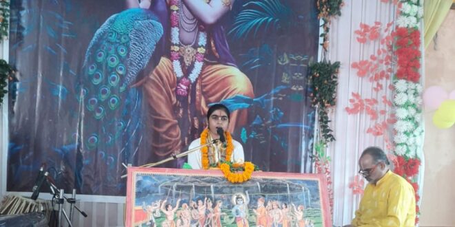 बिसौली। नगर के श्री लक्ष्मी नारायण बड़ा मंदिर श्रीमद् भागवत पंचम दिवस की कथा में पूजा अंबिका देवी ने भगवान कृष्ण की लीलाओं का वर्णन किया कंस के द्वारा भेजी हुई राक्षसी पूतना वध की चर्चा की, किस तरह से कंस के द्वारा गोकुल में जन्मे सभी अबोध बच्चे 10- 12 दिन में जन्म लिए हुए बच्चों को मार दिया जाए ऐसा आदेश दिया राक्षसी सुंदर स्त्री का भेष बनाकर गोकुल में नंद बाबा के घर आई भगवान कृष्ण ने राक्षसी का वध कर दिया भगवान कृष्ण और बलराम का नामकरण गौशाला में गुरुजी के द्वारा किया गया भगवान धीरे-धीरे घुटने चलने लगे गौशाला में गाय के गोबर को शरीर पर लपेटकर उससे स्नान करते हैं थोड़ा और बड़े होने पर माखन दूध दही को खाने के लिए ग्वाल वालों के साथ ब्रज के गोपियों के घर माखन चुराने जाने लगे गोपियों द्वारा माता यशोदा से शिकायत और भगवान कृष्ण का मुस्कुरा कर जवाब देना की माता यह गोपिया पहले तो मुझे माखन खिलाने के लिए अपने घर बुलाती है अब आपसे शिकायत करने आ रही है देवी जी द्वारा गिरिराज गोवर्धन महाराज की पूजा के बारे में बताया गिरिराज धरण हम तेरी शरण श्री गोवर्धन महाराज महाराज तेरे माथे मुकुट विराज रहो भक्त जनों ने पूर्ण भाव और श्रद्धा के साथ कथा का आनंद लिया अन्नकूट प्रसाद वितरण किया गया। इस अवसर पर संजय कुमार अग्रवाल, कन्हैया लाल अग्रवाल, सोनू गुप्ता, दीपक, हर्षित गुप्ता, प्रखर, सोहिल, निशांत अग्रवाल, संजीव कुमार अग्रवाल, शताक्षी अग्रवाल, सीमा अग्रवाल, मधु अग्रवाल, रानी अग्रवाल, संगीता अग्रवाल, संगीता रस्तोगी, सरिता वार्ष्णेय, विनीत गुप्ता, सोना शर्मा, कंचन शर्मा, राशि शर्मा, कविता आनंद, मंजू कथूरिया, चंचल ठक्कर आदि भक्तजन उपस्थित रहे।