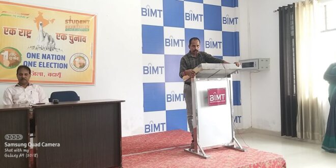 आज बदायूं के इंस्टिट्यूट बी.आई.एम.टी .कॉलेज में एक राष्ट्र एक चुनाव के संदर्भ में विचार गोष्ठी का आयोजन किया जिसमें मुख्य वक्ता डॉक्टर मोहनलाल मौर्य कॉलेज के प्रबंधक अक्षत रस्तोगी जी तथा बदायूं जिले के वन नेशन वन इलेक्शन के जिला संयोजक योगेश शर्मा भी उपस्थित रहे जिला जिला संयोजक योगेश शर्मा ने कहा कि अगर देश में एक ही साथ विधानसभा और लोकसभा के चुनाव कराए जाएं तो देश की अर्थव्यवस्था तथा विकास कार्यों में गति प्रदान होगी और जो जो जनता का पैसा है वह चुनाव में अधिक खर्च न होकर देश की अर्थव्यवस्था तथा विकास कार्यों में लगेगा | मुख्य वक्ता डॉक्टर मोहनलाल मौर्य ने बताया कि हमारे देश की जीडीपी बढ़ जाएगी और भारत चौथी अर्थव्यवस्था से हटकर तीसरी अर्थव्यवस्था बन जाएगा इंस्टिट्यूट के प्रबंधक ने धन्यवाद ज्ञापित किया