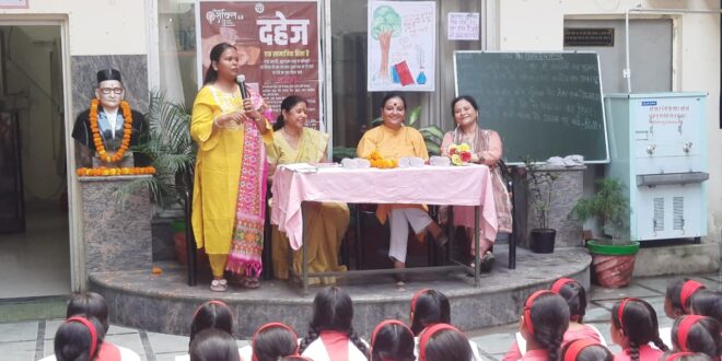 आज विशेष कार्यक्रम सेवा पखवाड़ा के तहत न दहेज लेने, न दहेज देने हेतु शपथ ग्रहण समारोह कार्यक्रम का आयोजन किया गया । हब फॉर एंपावरमेंट ऑफ़ वीमेन टीम के द्वारा राजाराम महिला इण्टर कॉलेज बदायूॅ मे ंन दहेज लेने, न दहेज देने हेतु शपथ ग्रहण समारोह का आयोजन किया गया सर्वप्रथम छवि वैश्य जिला मिशन समन्वयक द्वारा मुख्यमंत्री कन्या सुमंगला योजना, पाक्सो एक्ट, पी0 सी0 पी0 एन0 डी0 टी0 एक्ट, 181,1090,1098,112,1930 हेल्प लाइन नं0 की जानकारी दी गयी बालिकाओं को दहेज के दुष्प्रभाव के बारे मे बताया गया। बालिकाओ ने भी अपने विचार व्यक्त किये अपने स्वयं के परिवार का उदाहरण भी दिया । श्रीमती दीपमाला गोयल जी ने बच्चों को आत्मनिर्भर बनने हेतु प्रोत्साहित किया अपने आसपास हो रही परिस्थितयों से सतर्क रहें। कार्यक्रम का समापन प्रधानाचार्या श्रीमती अनीता जी के द्वारा किया गया व विधालय स्टॉफ भी मौजूद रहा। छवि वैश्य जिला मिशन समन्वयक द्वारा दहेज न लेने व न देने हेतु शपथ ग्रहण भी करायी गयी।