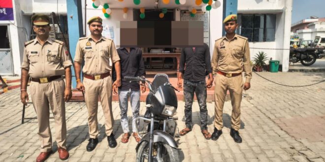 कस्बा सहसवान में राय साहब की कोठी के सामने से एक अदद मो0सा0 हीरो स्पलेन्डर नं0 UP24X6181 की हुई चोरी के सम्बन्ध में थाना हाजा पर पंजीकृत मु0अ0सं0 393/25 धारा 303(2)BNS अज्ञात के अनावरण हेतु थाना सहसवान पर उ0नि0 श्री विनोद कुमार के नेतृत्व में गठित टीम द्वारा मुखबिर की सूचना पर महाविद्यालय की ओर जाने वाले कच्चे रास्ते वाले तिराहे से 02 अभि0 1. अवधेश पुत्र राकेश 2. रिंकू पुत्र इतवारी निवासीगण ग्राम काशीपुर थाना जुनावई जनपद सम्भल को एक अदद चोरी की मो0सा0 हीरो स्पलेन्डर नं0 UP24X6181 के पकडा गया । अभियुक्तगण ने पूछताछ में बताया कि हम लोग मोटर साईकिलो की चोरी करने है, हम लोग आज भी चोरी के करने के लिये जा रहे थे कि हम हम लोगो अपने दो साथी 1. ललतेश पुत्र कुंवरपाल उर्फ बंटी 2. सहदेव पुत्र हरी सिंह निवासीगण ग्राम काशीपुर थाना जुनावई जनपद सम्भल का आने का इंतजार कर रहे थे कि आपने हमने पकड लिया । हम चारो लोग मिलकर मोटर साईकिल की चोरी करते है।
