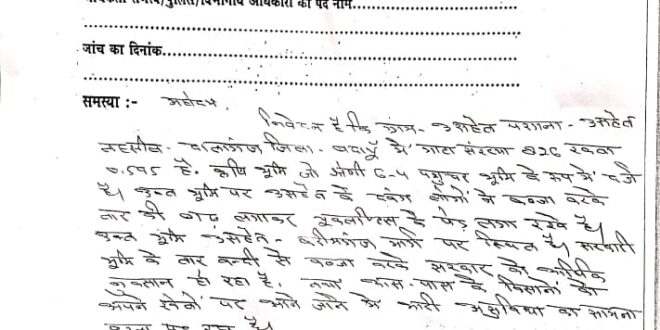 उसहैत में सरकारी भूमि पर पेड़ लगाकर बीलामई में चकरोड काटकर दबंगो ने किया कब्जा तहसील दिवस दातागंज मे समाज सेवी किसान ने शिकायती पत्र देकर कब्जा मुक्त कराने की लगई गुहार-शनिवार को नगर उसहैत निवासी एक समाजसेवी किसान इरशाद हुसैन पुत्र इनायत हुसैन ने दातागंज तहसील दिवस में पहुंचे तहसील दिवस में एडीएम ने किसानो की समस्याओ को सुना एसडीएम व थानाप्रभारी को जल्द निस्तारण करने के दिशा-निर्देश दिये उसहैत के दबंग काश्तकारो द्वारा उसहैत करीमनगर रोड पर सरकारी भूमि है गाटा सं08826रकबा 0,595हे0 क्रषि भूमि जो श्रेणी 6-4पर दर्ज पशुचर भूमि पर दबंगो द्बारा तारकसी व यूकेलिप्टस के पेड़ लगाने व कब्जा करने का आरोप लगाया है वही समाज सेवी ने बीलामई में भूमि गाटा सं090रकबा 0,053 हे0 चकमार्ग है उन्होने बीलामई व आसपास के दबंग काश्तकारो पर चकरोड काटकर अपने अपने खेतो में मिलाने व आनेजाने का रास्ता बंद करने काआरोप लगाते हुये शिकायती पत्र दिया है आने वाले किसानों के लिए रास्ता बंद होने से परेशानियों का सामना करना पड़ रहा है उन्होंने कहा पर सरकारी भूमि पर तारकशी व यूकेलिप्टस के पेड़ लगाकर कब्जा करने वाले दबंगो से सरकार को आर्थिक नुकसान। होरहा है समाज सेवी इरशाद हुसैन के शिकायती पत्र को संज्ञान लेते हुए एडीएम ने राजस्व टीम को दिशा-निर्देश दिये हैं