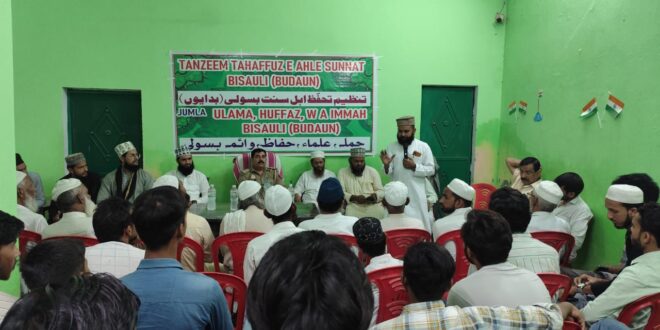 बिसौली। पुलिस इंस्पेक्टर हरेंद्र सिंह ने सामाजिक सद्भाव बनाए रखने के उद्देश्य से मुस्लिम धर्म गुरुओं और नगर के प्रमुख लोगों के साथ एक बैठक का आयोजन किया। उन्होंने सभी धर्मगुरुओं से अपील की कि वह अपने समुदाय में शांति और भाईचारे का संदेश फैलाएं। पुलिस इंस्पेक्टर हरेंद्र सिंह ने यह भी स्पष्ट किया कि कानून व्यवस्था बनाए रखना हम सभी की सामूहिक जिम्मेदारी है। उन्होंने कहा वह किसी भी तरह की अफवाहों पर ध्यान न दें और तुरंत पुलिस को सूचित करें। बैठक में मौजूद सभी धर्मगुरुओं ने इंस्पेक्टर हरेंद्र सिंह की सराहना की और शांति बनाए रखने के लिए पूरा सहयोग देने का वादा किया। बैठक में क़ादरी मस्जिद के इमाम मौलाना अफ़लाक रज़ा उवैसी, मदरसा फैज़ान ए रज़ाए मुस्तफ़ा के सदर मौलाना इफ़्तेखार हुसैन अशरफी, बड़ी मस्जिद के इमाम मौलाना बिलाल साहब,मस्जिद बिलाल के इमाम हाफ़िज़ शादाब रज़ा उवैसी, मदीना मस्जिद के इमाम हाफ़िज़ मज़हर खान, मस्जिद के इमाम रफ़ीक़ खां, हाफ़िज़ नोमान खान, हाफ़िज़ कैफ, हाफ़िज़ रज़ा, क़ादरी मस्जिद के सदर फय्याज़ खान, मशहूद खां हमदम, हाजी तस्लीम खान, बड़ी मस्जिद के सदर मुन्ने खां, वक़ील अब्बासी, ज़ाकिर सैफी, हकीम इक़बाल मलिक, नदीम फारूकी, आरिफ फारूकी, रहीस अंसारी, मुजाहिद फारूकी, डॉ शुएब, इमरान मलिक, खुर्शीद सैफी, हाजी लईक, सभासद रहीस सैफी, कमर अंसरी, नज़र अंसारी, इमरुल आदि मौजूद रहे।
