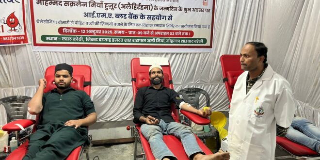 – आज दिनांक 12 अक्टूबर 2025 मुताबिक़ 19 रबीउस्सानी दिन इतवार *पीरो मुर्शिद हज़रत शाह मोहम्मद सकलैन मियाँ हुज़ूर अलैहिर्रहमा के यौमे विलादत (जन्मदिन) के मुबारक मौक़े पर* दरगाह शाह शराफ़त मियाँ के पास लाल कोठी में *फ़ैज़ाने शाह सकलैन फ़ाउंडेशन की तरफ़ से* एक विशाल रक्तदान शिविर का आयोजन किया गया, ये रक्तदान शिविर आई.एम.ए. ब्लड बैंक के सहयोग से आयोजित हुआ, जिसका उद्देश्य थेलीसिमिया बीमारी से जो बच्चे जूझ रहे हैं उन बच्चों व जरूरतमंद मरीज़ों की ज़िंदगी बचाने के लिए था।