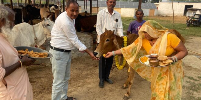 मुजरिया विकासखंड सहसवान के अंतर्गत पशुपालन विभाग की ओर से संबंधित ग्राम प्रधान गणो के सहयोग से गोवर्धन पूजा के अवसर पर गायों का पूजन विधि रूप से गुण को खिलाकर किया गया इस अवसर पर विकासखंड सहसवान के ग्राम पंचायत कोल्हाई की गौशाला में प्रधान मीना देवी एवम प्रधान पति पप्पू शाक्य व पशुधन प्रसार अधिकारी शैलेंद्र कुमार सिंह पैरावेट एन पी एस सैलानी सहित अन्य गौशालाओ मे ग्राम पंचायत इब्राहिमपुर गढ़ी तथा नगर पालिका सहसवान और बिचौला टप्पा जामनी में आज की गौशाला में ग्राम प्रधानों के सहयोग से पशु पालन विभाग की संयुक्त टीम के द्वारा गायों का पूजन विधिवत रूप से गोवर्धन पूजा के अवसर पर किया गया इस अवसर पर सभी टीम मौजूद रही