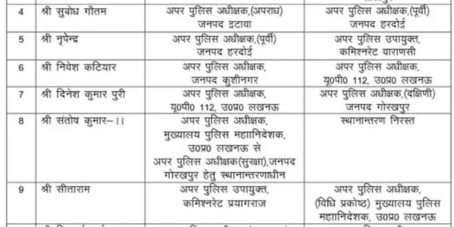 लखनऊ: उत्तर प्रदेश में पुलिस विभाग में बड़ा फेरबदल किया गया है। आज रविवार को 23 एडिशनल एसपी (ASP) के ट्रांसफर किए हैं। यह कदम राज्य के विभिन्न जिलों में पुलिस प्रशासन को और अधिक मजबूत और कुशल बनाने के उद्देश्य से उठाया गया है।