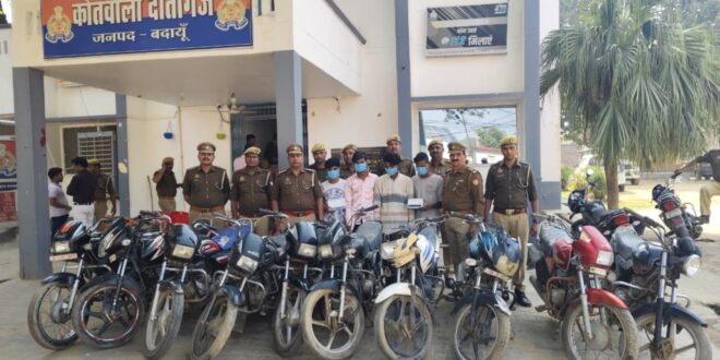 थाना दातागंज पुलिस ने आज दिनांक 10 नवम्बर, 2025 को गस्त और संदिग्ध व्यक्तियों की चेकिंग के दौरान चार अभियुक्तों को चोरी की गई 10 मोटरसाइकिल, एक मोबाइल और एक चाकू के साथ गिरफ्तार किया।