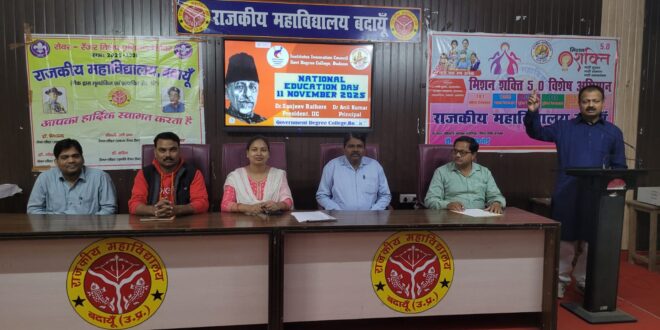 बदायूं। राजकीय महाविद्यालय आवास विकास में मंगलवार को स्वतंत्र भारत के पहले शिक्षा मंत्री मौलाना अबुल कलाम आजाद की जयंती के अवसर पर राष्ट्रीय शिक्षा दिवस समारोह आयोजित किया गया। महाविद्यालय में गठित इंस्टीट्यूशन इनोवेशन काउंसिल (आईईसी) के तत्वावधान में विचार गोष्ठी का आयोजन किया गया।