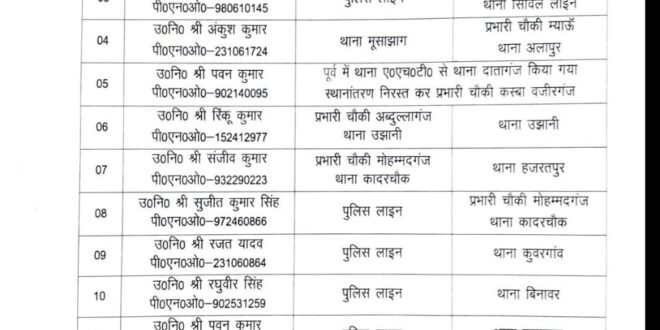 वरिष्ठ पुलिस अधीक्षक बदायूं ने जिले में पुलिस व्यवस्था को और अधिक प्रभावी बनाने के उद्देश्य से व्यापक स्तर पर फेरबदल किया है। जारी आदेश के अनुसार कई उप निरीक्षकों एवं पुलिस कर्मियों के स्थानांतरण किए गए हैं।
