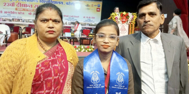 बिल्सी, 14 नवम्बर। नगर के मोहल्ला संख्या एक की प्रतिभाशाली छात्रा सोनिका वाष्र्णेय ने एमजेपी रुहेलखंड विश्वविद्यालय से बीटेक में टॉप कर गोल्ड मेडल प्राप्त किया है। बृहस्पतिवार शाम विश्वविद्यालय के दीक्षांत समारोह में प्रदेश की राज्यपाल आनंदीबेन पटेल ने सोनिका को गोल्ड मेडल पहनाकर सम्मानित किया। इस दौरान कुलपति कृष्णपाल सिंह सहित विश्वविद्यालय के कई अधिकारी मौजूद रहे।
