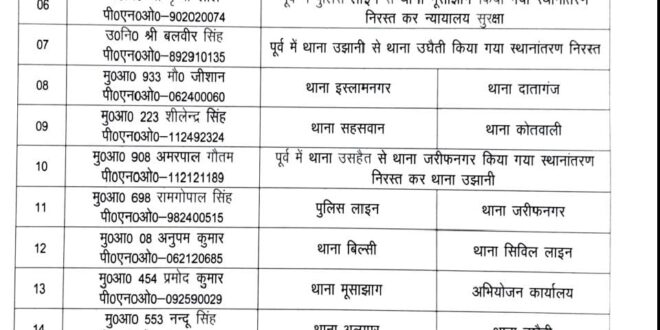 बदायूँ। जिले में पुलिस व्यवस्था को और अधिक चुस्त-दुरुस्त बनाने के लिए वरिष्ठ पुलिस अधीक्षक बदायूँ ने गुरुवार को कई अधिकारी एवं कर्मचारियों के स्थानान्तरण कर दिए हैं। एसएसपी की ओर से जारी आदेश में बताया गया है कि यह तबादले प्रशासनिक आवश्यकता एवं कार्य-दक्षता को ध्यान में रखकर किए गए हैं।
