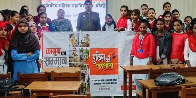 बदायूँ। आज राजकीय महिला महाविद्यालय में अपर पुलिस अधीक्षक नगर विजयेन्द्र द्विवेदी द्वारा आयोजित पुलिस पाठशाला कार्यक्रम में छात्राओं को पुलिस कार्यप्रणाली, जीवन शैली, कानूनी प्रावधानों, साइबर अपराध, यातायात नियम एवं विभिन्न हेल्पलाइन नंबरों की विस्तृत जानकारी दी गई।