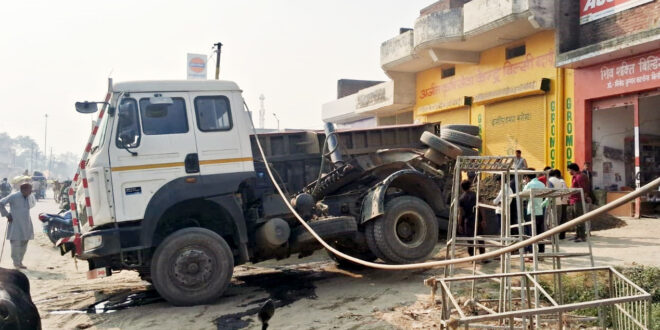 क्षेत्र के गांव बांस बरोलिया निवासी शिवेंद्र कुमार ने बताया कि उनकी दुकान पर ट्रक से बदरपुर अनलोड किया जा रहा था। तभी अचानक ट्रक का जैक टूट गया और ट्रक बगल की ओर पलट गया। पास में रखा जितेंद्र का परचून का खोखा इसकी चपेट में आकर मलबे में दब गया। हादसे से पास में खड़े कई लोग बाल-बाल बच गए।
