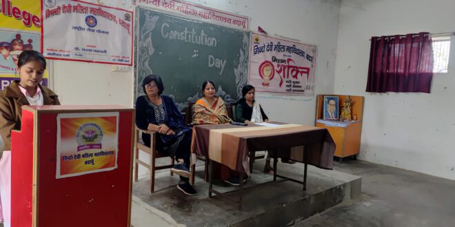 गिंदो देवी महिला महाविद्यालय में बुधवार को नेशनल सर्विस स्कीम (NSS) के तहत संविधान दिवस के अवसर पर शपथ ग्रहण समारोह का आयोजन किया गया। कार्यक्रम की शुरुआत प्राचार्या प्रो. सरला चक्रवर्ती ने माँ सरस्वती के समक्ष दीप प्रज्वलित करके की।