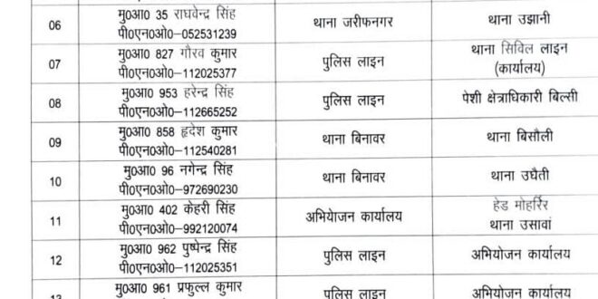 बदायूँ। वरिष्ठ पुलिस अधीक्षक, बदायूँ ने जिले के विभिन्न थानों एवं विभागों में तैनात अधिकारियों और कर्मचारियों के स्थानान्तरण आदेश जारी किए हैं। इस स्थानान्तरण के अंतर्गत कई अधिकारियों और कर्मचारियों को नए पदों पर नियुक्त किया गया है।