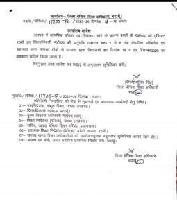 जनपद में लगातार बढ़ रहे घने कोहरे और शीतलहर को देखते हुए प्रशासन ने बच्चों के स्वास्थ्य को ध्यान में रखते हुए बड़ा निर्णय लिया है। जिलाधिकारी की अनुमति के बाद कक्षा 1 से 8 तक संचालित परिषदीय, सहायता प्राप्त एवं समस्त बोर्डों से मान्यता प्राप्त विद्यालयों में 19 व 20 दिसम्बर 2025 को अवकाश घोषित किया गया है।