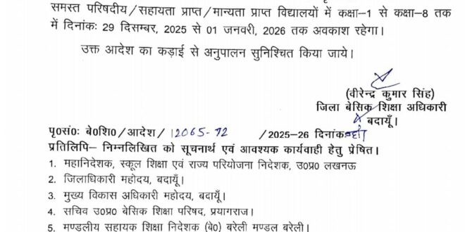जनपद में पड़ रही भीषण ठंड को देखते हुए बच्चों के स्वास्थ्य की सुरक्षा के मद्देनज़र बड़ा निर्णय लिया गया है। महानिदेशक, स्कूल शिक्षा एवं राज्य परियोजना निदेशक, उत्तर प्रदेश, लखनऊ द्वारा 28 दिसंबर 2025 को व्हाट्सएप ग्रुप के माध्यम से जारी निर्देशों के अनुपालन में जनपद के सभी परिषदीय, सहायता प्राप्त एवं मान्यता प्राप्त विद्यालयों में कक्षा 1 से कक्षा 8 तक के विद्यार्थियों के लिए अवकाश घोषित किया गया है।