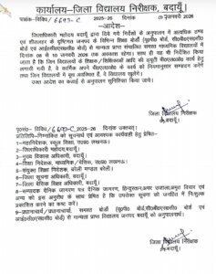 जिला विद्यालय निरीक्षक बदायूँ द्वारा जारी आदेश के अनुसार जनपद में विभिन्न शिक्षा बोर्डों—उत्तर प्रदेश बोर्ड, सीबीएसई एवं आईसीएसई बोर्ड—से मान्यता प्राप्त सभी संचालित माध्यमिक विद्यालयों में उक्त अवधि के दौरान पठन-पाठन स्थगित रहेगा।