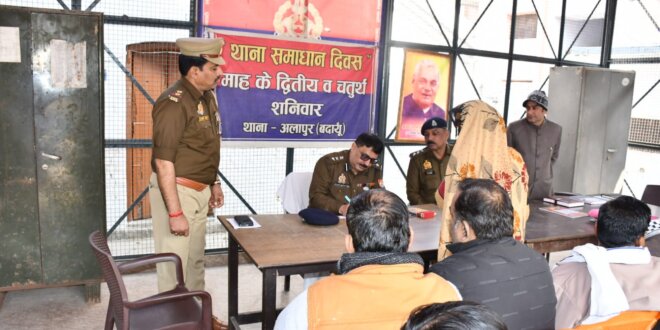थाना दिवस/समाधान दिवस के अवसर पर वरिष्ठ पुलिस अधीक्षक बदायूँ डॉ. बृजेश कुमार सिंह ने थाना अलापुर पर उपस्थित रहकर फरियादियों की समस्याएं सुनीं। उन्होंने प्राप्त शिकायतों के विधिक एवं समयबद्ध निस्तारण के लिए संबंधित अधिकारियों को आवश्यक दिशा-निर्देश दिए। एसएसपी ने स्पष्ट कहा कि जनशिकायतों की निष्पक्ष जांच करते हुए त्वरित एवं गुणवत्तापूर्ण निस्तारण सुनिश्चित किया जाए।
