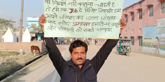 एलआईसी से मोहल्ला गोपालगंज जाने वाले मार्ग पर बीते तीन वर्षों से जलभराव और जर्जर सड़क की समस्या से परेशान एक दुकानदार युवक ने शनिवार को पोस्टर लेकर सड़क पर प्रदर्शन किया। लगातार जलभराव के कारण उसकी दुकान खुल नहीं पा रही है, जिससे उसके सामने रोजी-रोटी का संकट खड़ा हो गया है।