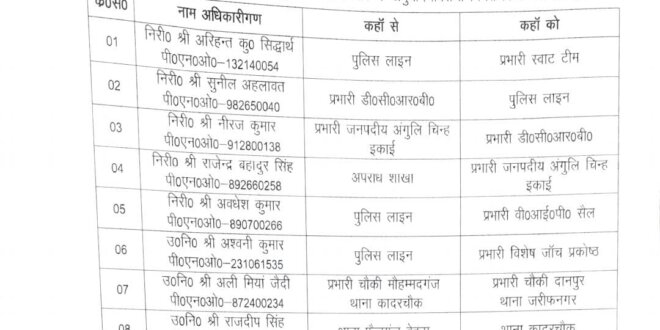 उपनिरीक्षक स्तर पर भी कई अहम बदलाव किए गए हैं। उपनिरीक्षक अश्वनी कुमार (पीएनओ-231061535) को पुलिस लाइन से प्रभारी विशेष जांच प्रकोष्ठ बनाया गया है। उपनिरीक्षक अली मियां जैदी (पीएनओ-872400234) का स्थानांतरण चौकी मोहम्मदगंज, थाना कादरचौक से चौकी दानपुर, थाना जरीफनगर किया गया है।