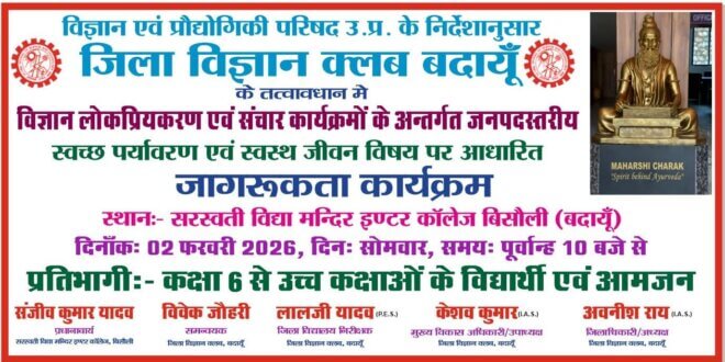 जिला विज्ञान क्लब बदायूं द्वारा विज्ञान एवं प्रौद्योगिकी परिषद उत्तर प्रदेश, विज्ञान एवं प्रौद्योगिकी विभाग उत्तर प्रदेश के तत्वावधान में स्वच्छ पर्यावरण एवं स्वस्थ जीवन विषय पर आधारित जागरूकता कार्यक्रम का आयोजन सरस्वती विद्या मंदिर इंटर कॉलेज बिसौली में किया जाएगा।