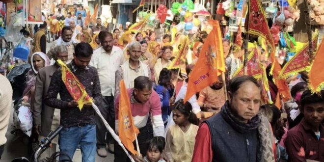 शोभायात्रा नगर के प्रमुख मार्गों से होकर मुख्य बाजार पहुंची, जहां श्रद्धालुओं ने पुष्प वर्षा कर यात्रा का भव्य स्वागत किया। ढोल-नगाड़ों की गूंज और जयकारों से वातावरण भक्तिमय हो गया। श्रद्धालु हाथों में ध्वज लेकर भक्ति गीतों पर झूमते नजर आए।
