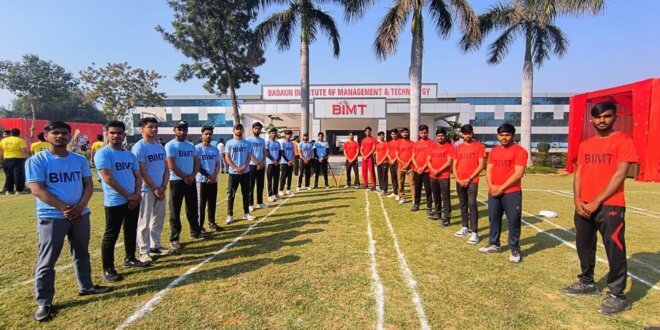 बदायूं। बी.आई.एम.टी. कालेज में वार्षिक खेल प्रतियोगिता 2026 का आयोजन बड़े उत्साह के साथ किया गया। प्रतियोगिता का शुभारंभ महाविद्यालय निदेशक अक्षज रस्तोगी, आशीष सिंधल, विकास आहूजा और महाविद्यालय डीन अरविन्द कुमार गुप्ता तथा जिला क्रीड़ा अधिकारी अमित रिछारिया ने सयुक्त रूप से मां सरस्वती के समक्ष दीप प्रज्ज्वलित और पुष्प अर्पित कर किया। तत्पश्चात सभी प्रतियोगी छात्रों और संकाय शिक्षकों ने राष्ट्रगान गाया।