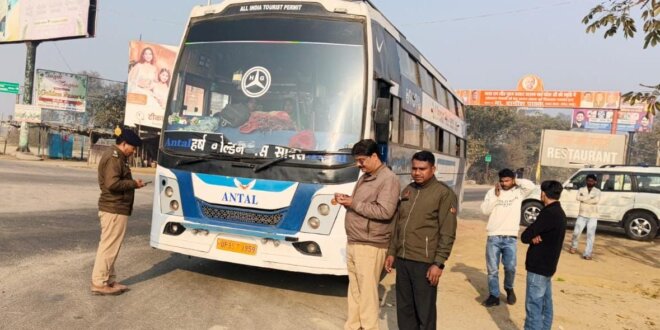 चेकिंग अभियान के दौरान दो बसें गलत तरीके से सवारी बैठाने एवं निर्धारित मानकों की अनदेखी करते हुए संचालित मिलें, जिनके विरुद्ध चालान की कार्रवाई की गई।