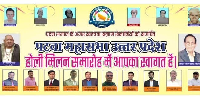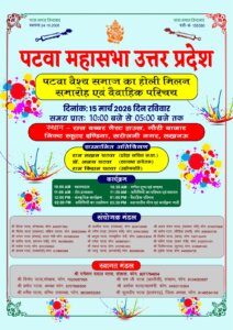 लखनऊ। पटवा महासभा उत्तर प्रदेश के तत्वावधान में पटवा वैश्य समाज का होली मिलन समारोह एवं वैवाहिक परिचय सम्मेलन रविवार 15 मार्च 2026 को आयोजित किया जाएगा। कार्यक्रम सुबह 10 बजे से शाम 5 बजे तक राज बब्बर गेस्ट हाउस, गौरी बाजार, स्कूटर इंडिया के निकट सरोजनी नगर, लखनऊ में होगा।